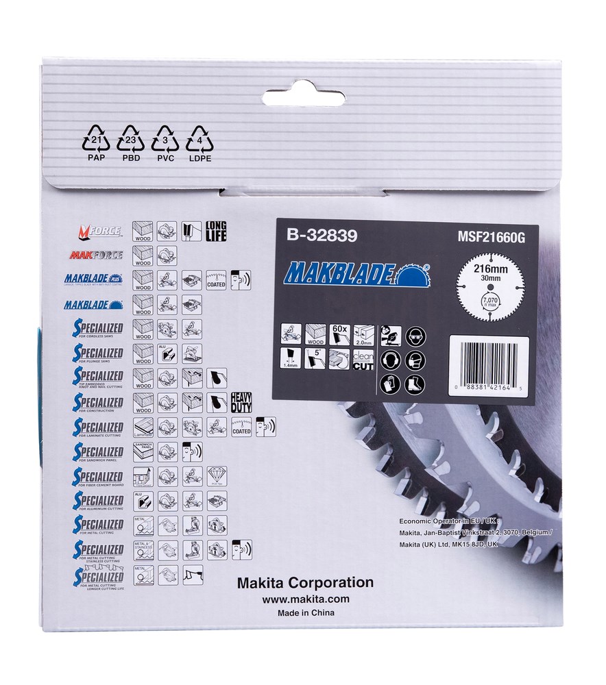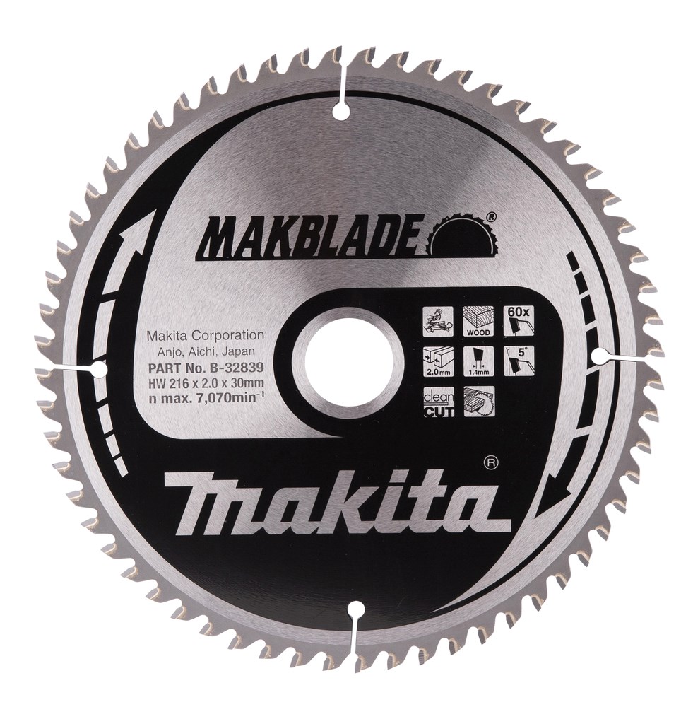 Contacteer onsMakita Artikelnummer: B-32839 CIRKELZAAGBLAD. MAKBLADE TCT. 216 X 30 MM. 60 T