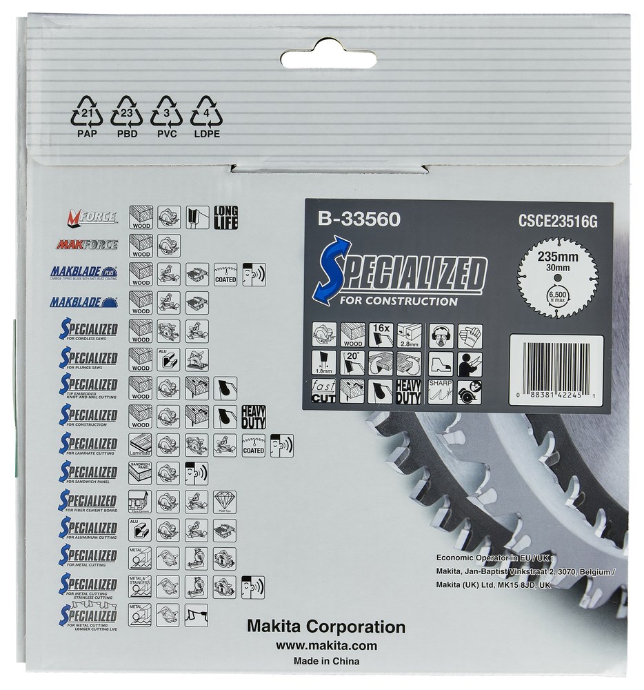 Contacteer onsMakita Artikelnummer: B-33560 CIRKELZAAGBLAD. SPECIALIZED TCT. 235 X 30 MM. 16 T