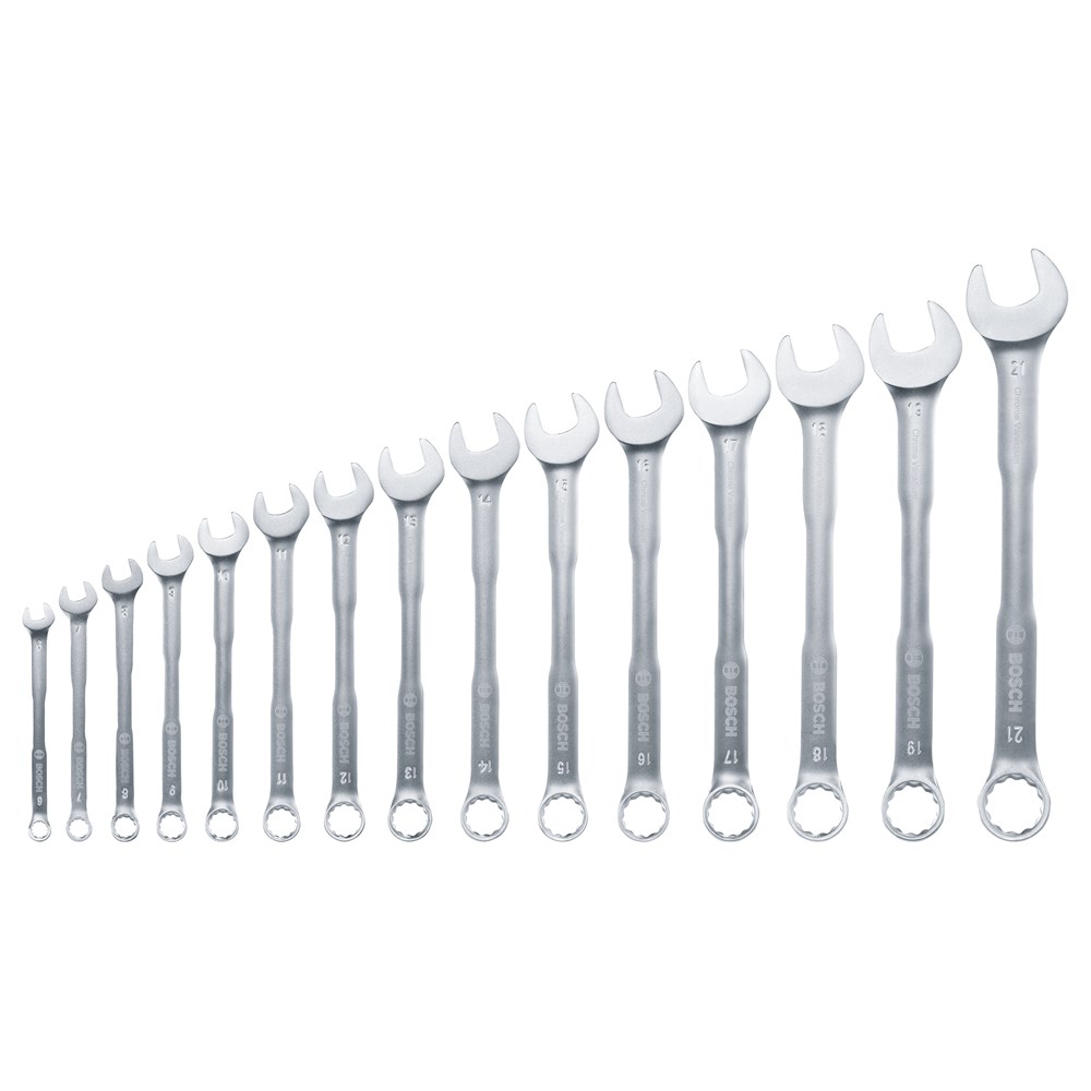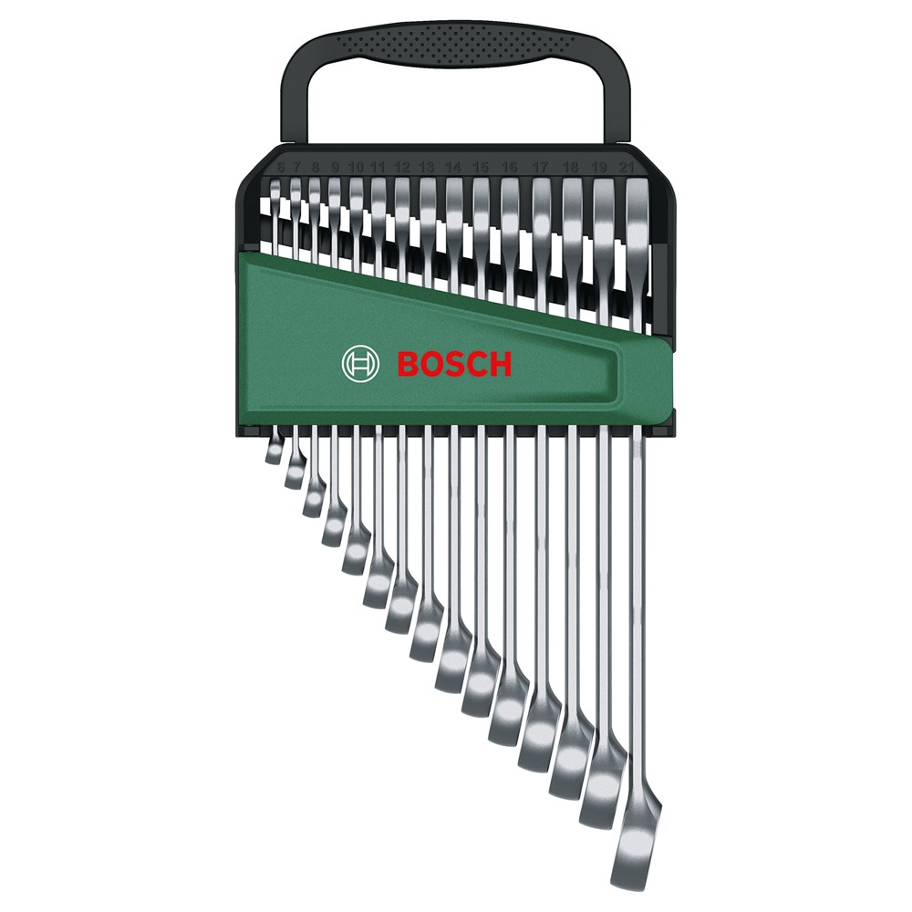 De moersleutel in de juiste maat is altijd bij de hand dankzij de 15-delige Bosch combinatiesleutelset. Deze premium sleutels zijn robuust en ergonomisch ontworpen, wat zorgt voor controle en comfort bij het vast- en losdraaien van doppen en bouten voor een groot aantal doe-het-zelfklussen.