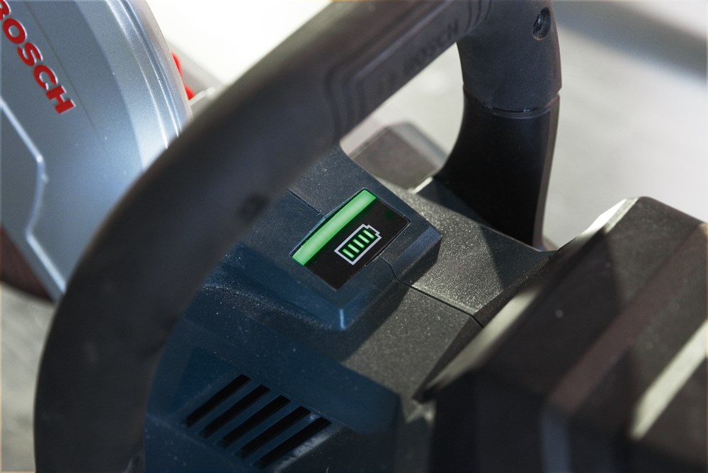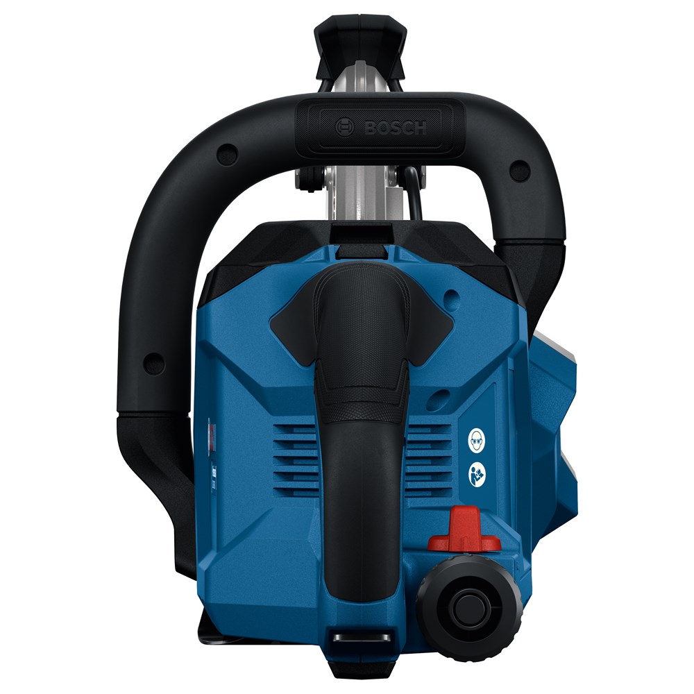 De Bosch doorslijpmachine GCS 18V-230 beschikt over een rondomlopende handgreep voor optimale balans van het gereedschap, 6 posities van de beschermkap, een ergonomische aan/uit-schakelaar met vergrendelingshendel, een slangadapter met snelkoppeling en een waterafsluitklep voor regeling van de watertoevoer voor nat slijpen in beton. De machine heeft ook een ledlicht voor verlichting van de werkplek en een accu-oplaadaanduiding