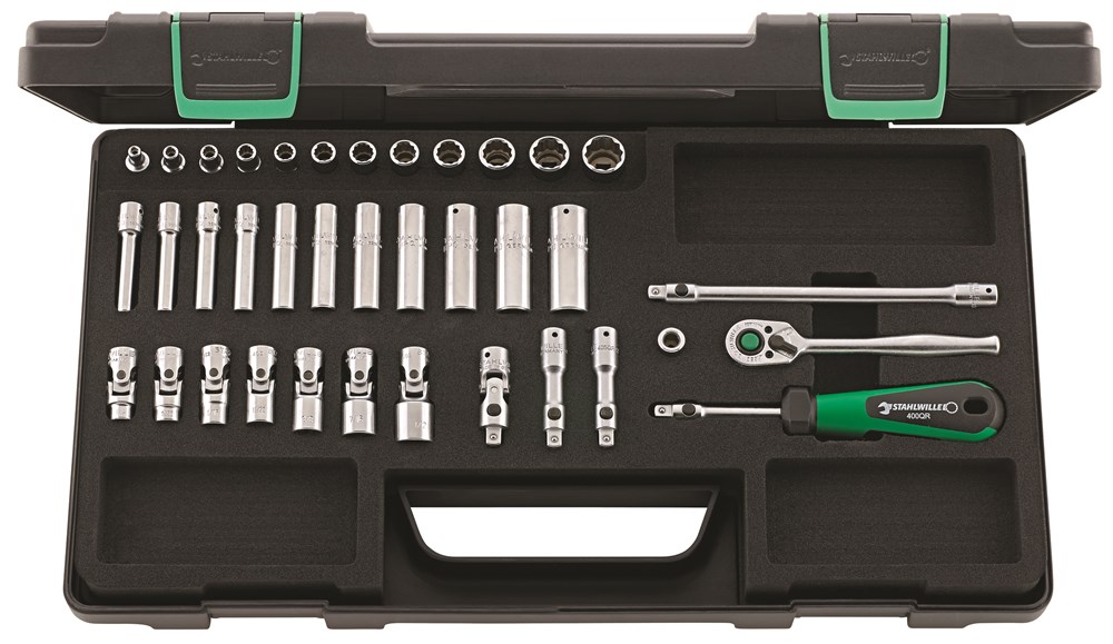Contacteer onsIn kunststoffen doos, 37-delig, inhoud: 1 dop, zeskant nr. 40a: 1/8"; 11 doppen, twaalfkant nr. 40aD: 5/32; 3/16; 7/32; 1/4; 9/32; 5/16; 11/32; 3/8; 7/16; 1/2; 9/16"; 11 doppen, twaalfkant, lang, nr. 40aDL: 5/32; 3/16; 7/32; 1/4; 9/32; 5/16; 11/32; 3/8; 7/16; 1/2; 9/16"; 7 cardandoppen, twaalfkant nr. 402a: 1/4; 9/32; 5/16; 11/32; 3/8; 7/16; 1/2"; 1 ratel nr. 415SGQR; 3 verlengstukken nr. 405/2QR (54 mm) (2x), nr. 405/6QR (150 mm); 1 cardangewricht nr. 407QR; 1 steekhecht nr. 400QR; 1 bithouder nr. 412.