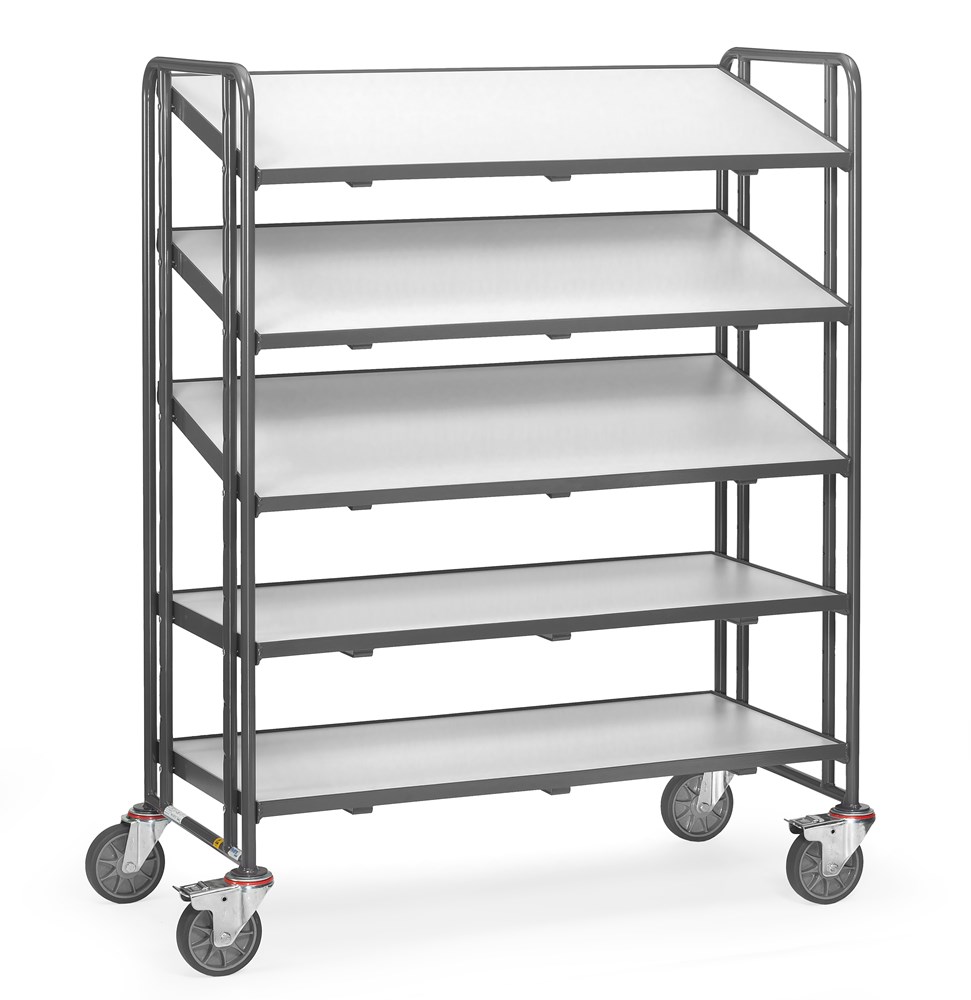 • 5 etages met 5 elektrostatisch geleidende houtvezelplaten, rand 7 mm hoog, voor ieder 3 eurobakken 600 x 400 mm, variabel inschroefbaar in een raster van 100 mm, neiging bij schuine inbouw 15° of 30°