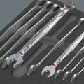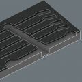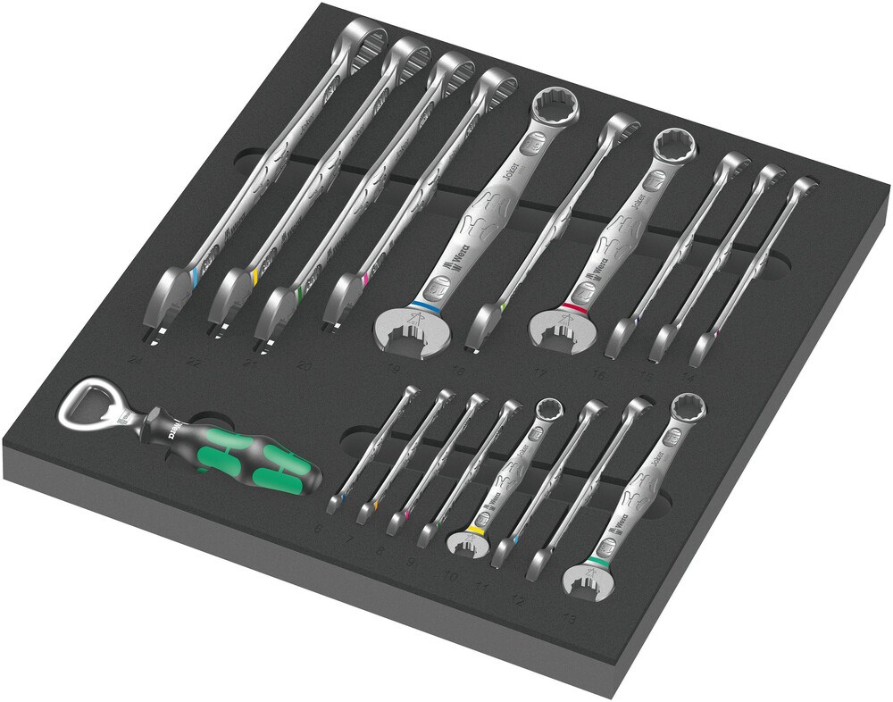 Duurzaam schuimrubberen inzetstuk; 2-kleurig om ontbrekende onderdelen snel te herkennen; geschikt voor de Tool Rebel werkplaatswagen; met 18 Wera 6003 Joker ringsteeksleutels en 1 Wera Kraftform flessenopener.
