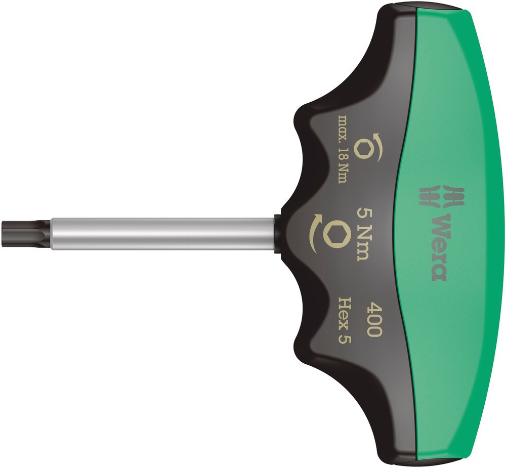 Wera draaimomentindicator met vast ingestelde draaimomentwaarde voor binnenzeskant- en TORX® schroeven. Beveiligd tegen manipulatie. De robuuste slipkoppeling staat garant voor een duidelijk hoorbaar en voelbaar signaal zodra de ingestelde draaimomentwaarde wordt bereikt; overschrijden van het draaimoment is dan ook onmogelijk. Aanzienlijk hoger losdraaimoment dan de ingestelde draaimomentwaarde, waardoor er in de meeste gevallen geen extra gereedschap vereist zal zijn voor het losdraaien van schroefverbindingen. Dankzij de vorm van de greep wordt de bal van de hand goed opgevuld en komen de vingers in de zacht afgeronde inkepingen in de greep te liggen. Daardoor is een optimale, ergonomische krachtoverdracht gewaarborgd.