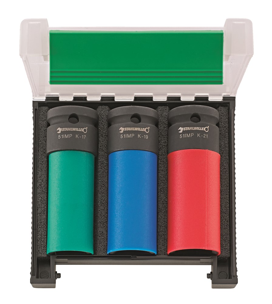Contacteer onsIn box, 3-delig, met beschermhuls, inhoud: 3 lange impact doppen, SW 17, 19 en 21 mm