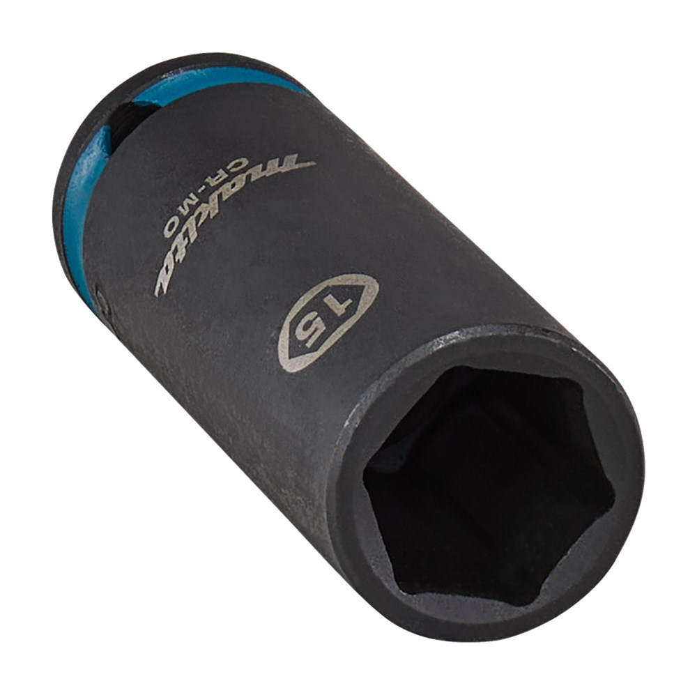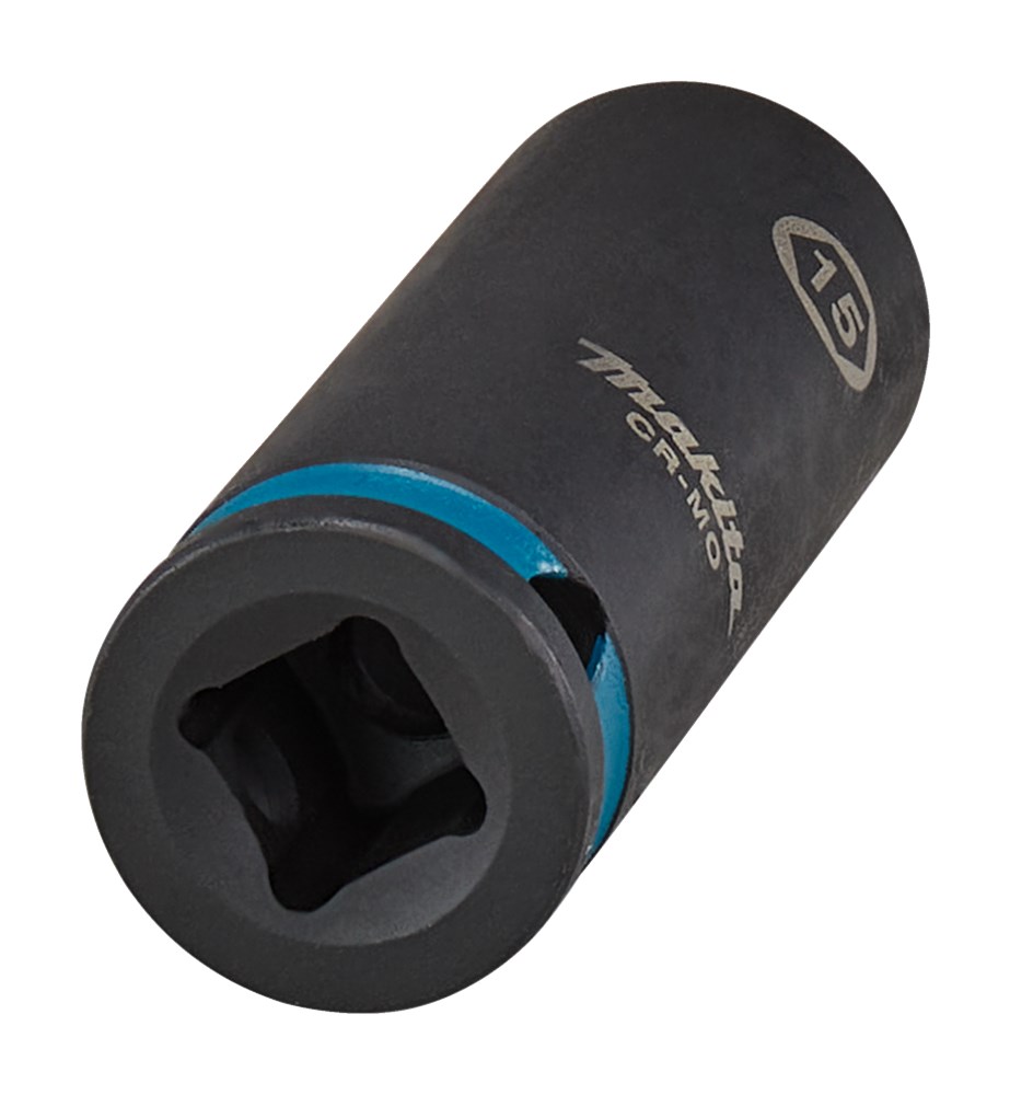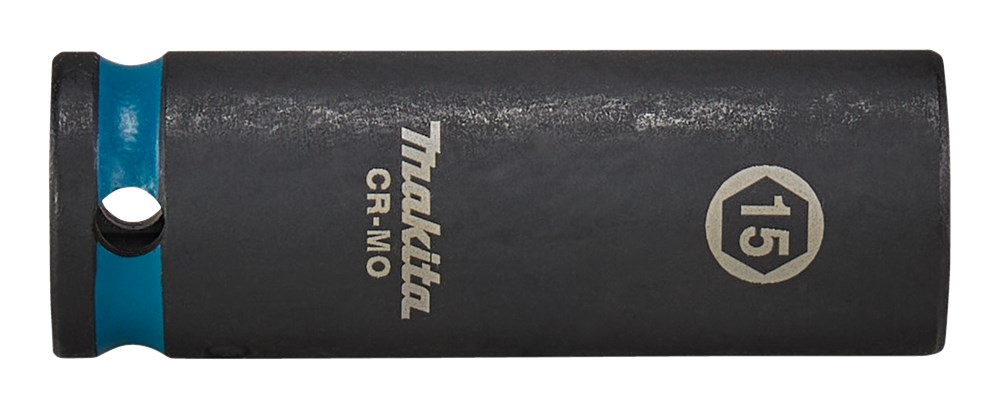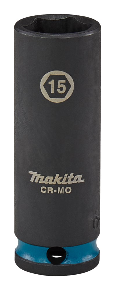 Makita Chroom-Molybdeem krachtdoppen in verschillende diameters en aansluitingen. Losse borgpennen en O-ringen staan in de categorie Borgpennen en O-ringen krachtdoppen. Extra lange Makita 15mm krachtdop uit de Impact Black serie, met 3/8" VK aansluiting met een werklengte van 63mm; perfect voor lastig bereikbare plaatsen. Deze dop is vervaardigd uit Chroom-Molybdeen, heeft een nauwkeurige passing en een lange levensduur. Voorzien van een Makita-teal gekleurde band en maataanduiding.