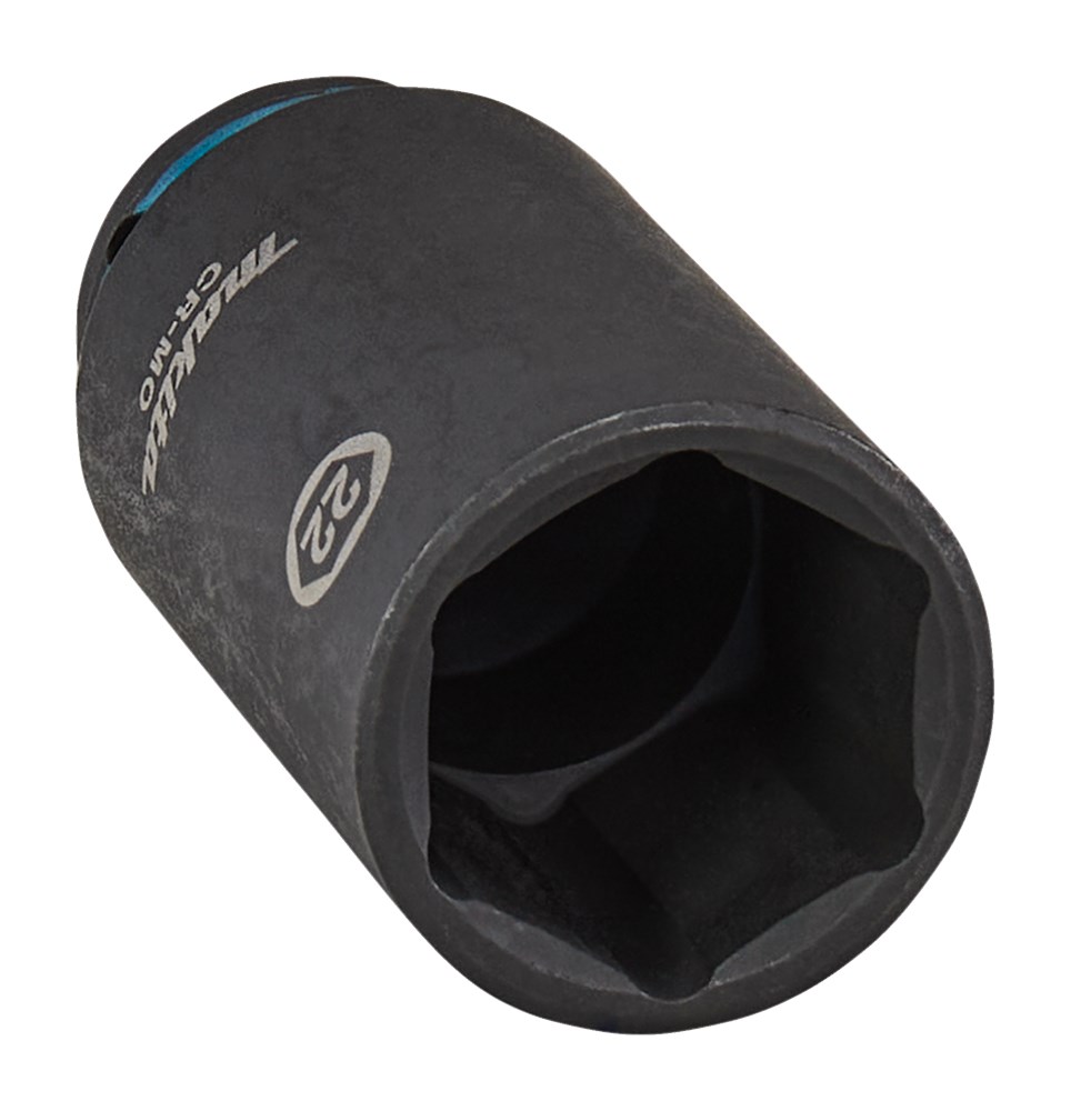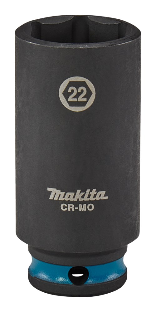 Makita Chroom-Molybdeem krachtdoppen in verschillende diameters en aansluitingen. Losse borgpennen en O-ringen staan in de categorie Borgpennen en O-ringen krachtdoppen. Extra lange Makita 22mm krachtdop uit de Impact Black serie, met 3/8" VK aansluiting met een werklengte van 63mm; perfect voor lastig bereikbare plaatsen. Deze dop is vervaardigd uit Chroom-Molybdeen, heeft een nauwkeurige passing en een lange levensduur. Voorzien van een Makita-teal gekleurde band en maataanduiding.