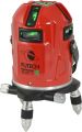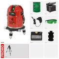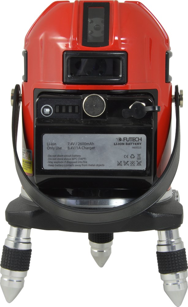 Contacteer onsKruislijnlaser met 4 groene horizontale en 4 verticale lijnen (= schietlood boven en onder + 4 hoeken van 90°). Elke lijn heeft 1 laserpuntje voor een betere zichtbaarheid, zelfs in een omgeving met veel licht of buiten. Elektronische motornivellering met 1mm/10m nauwkeurigheid. Bereik van 50m met ontvanger (optie). Fijnregeling draait laser precies rond schietlood. Li-Ion batterij met netstroomadapter/lader.