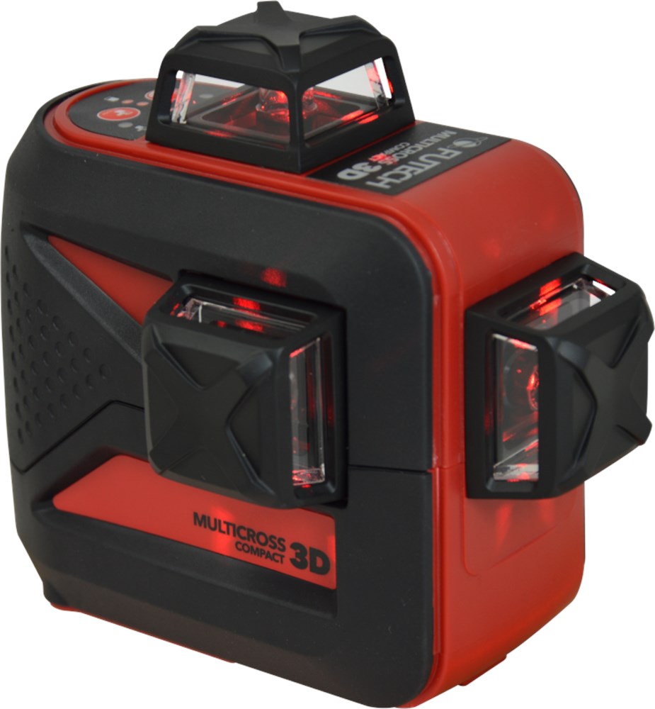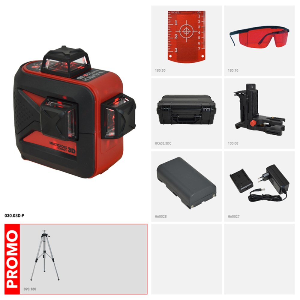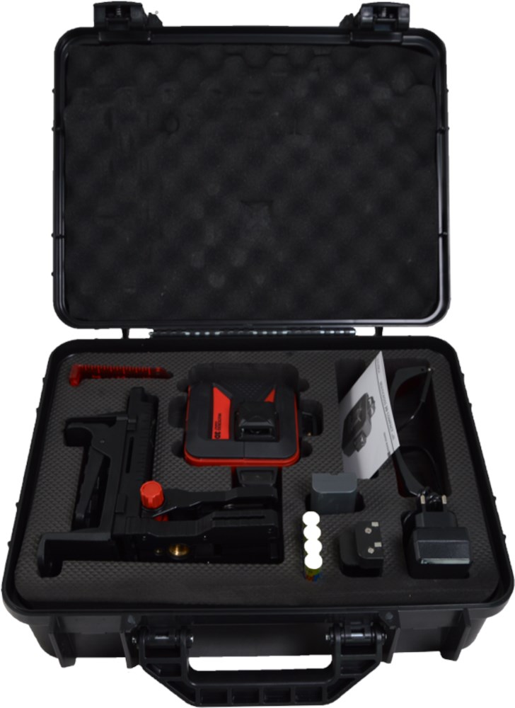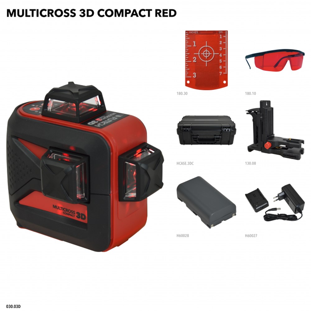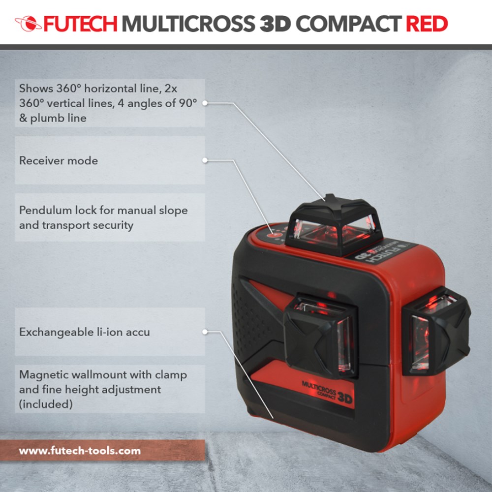 Contacteer ons3D Kruislijnlaser met 1 rode horizontale lijn rondom en 2 verticale lijnen rondom (= schietlood boven en onder + 4 hoeken van 90°). Pendelnivellering met 3mm/10m nauwkeurigheid. Geleverd met multifunctionele, magnetische wandhouder. Li-Ion batterij met netstroomadapter/lader.