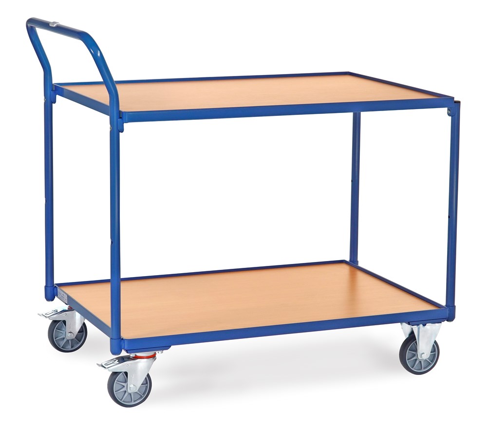 Contacteer onsStalen buis en gelast profielstaal, gepoedercoat. Schroefconstructie. 2 Etages van houten plaat, toplaag beukendecor, liggend in stalen frame, rand 12 mm hoog. Duwbeugel omhoogstaand. 2 Zwenk- en 2 bokwielen, TPE rubber, naaf met kogellager. Zwenkwielen met rem, conform EU-norm EN 1757-3 (veiligheidsnorm voor platformwagens). Draagvermogen bovenste etage 80 kg.