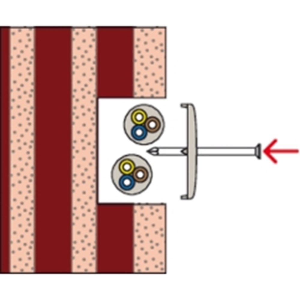 Contacteer onsDe fischer Nagelschijf NSB is een oplossing voor het bevestigen van kabels in openingen in muren en op houtconstructies. De nagelschijf van kwalitatief hoogwaardig polypropyleen en een geharde, gegalvaniseerde staalnagel zijn reeds voorgemonteerd. De nagelschijf wordt gepositioneerd en de nagel met behulp van een hamer ingeslagen – klaar. De fischer Nagelschijf NSB is geschikt om kabels met verschillende diameters in openingen in muren en op hout te bevestigen. Gemakkelijk onder pleisterwerk weg te werken door de vlakke nagelschijf.
