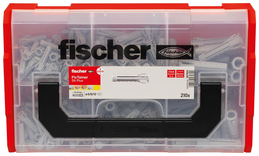 De SX Plus pluggenset bevat de fischer SX Plus spreidplug in de diameters 6, 8 en 10. De FixTainer boxen zijn voorzien van een draaggreep en een transparant deksel. Ze kunnen stevig met elkaar verbonden en dus gestapeld worden. Ze zijn ook compatibel met het Sortimo L-Boxx systeem.