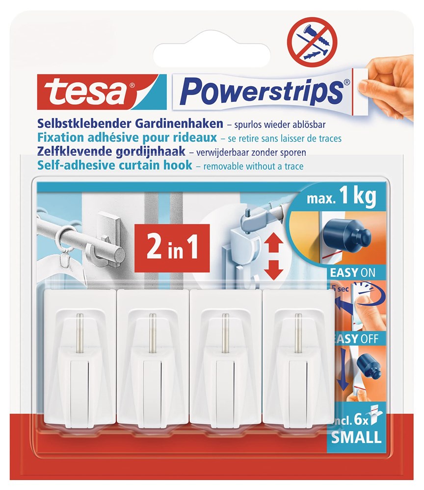 Contacteer onsZelfklevende tesa Powerstrips Gordijnhaken zijn een eenvoudige en schadevrije ophangoplossing, ontwikkeld om vrijwel elke keuken- of badkamergordijnrail rechtstreeks aan het raamkozijn te bevestigen. Om de gewenste privacy te bereiken, plak je de haken gewoon op het kozijn en haak je de gordijnrail vast. Gaten boren of speciaal gereedschap is niet nodig. Bovendien kan je deze haken op elk moment verwijderen zonder zichtbare sporen achter te laten op het raamkozijn. Daarna kan je ze zelfs hergebruiken voor elk ander venster van je woning.