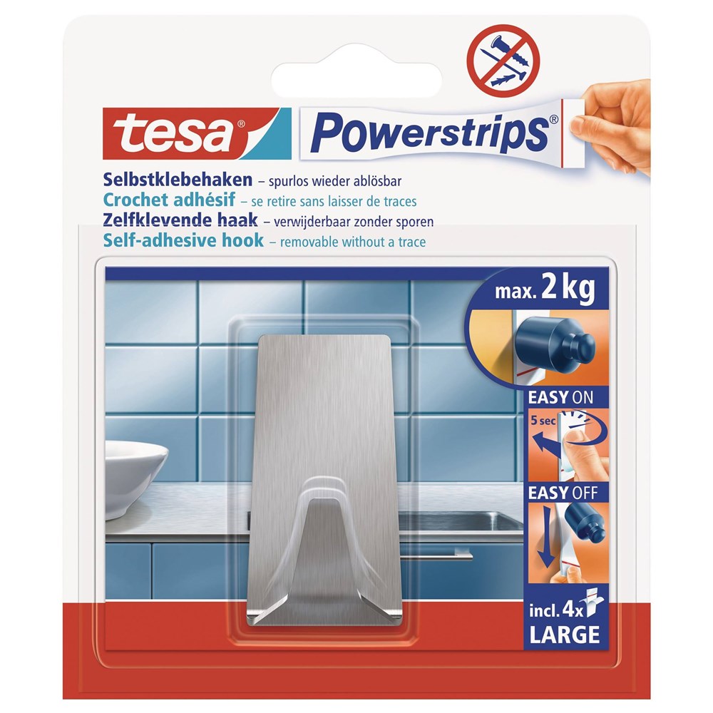 Contacteer onsKen je de slimste oplossing om thuis en op kantoor veilig en betrouwbaar lichte objecten op te hangen? Powerstrips® kleefhaken! In tegenstelling tot conventionele haken, die boorgaten vereisen, laten deze haken het oppervlak* onbeschadigd en verwijderd worden zonder lijmresten. Met de juiste kleefstrips kun je z ehergebruiken. De zelfklevende, metalen Powerstrips® haak Large, rechthoekig kan tot 2 kg dragen en is bijv. geschikt als kledinghaak, keukenhaak of haak voor sleutels. *Niet geschikt voor piepschuim, geschuimd materiaal, oppervlakken met antikleeflaag, poreus materiaal