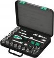 38-delige Zyklop-set in robuuste metalen koffer: Zyklop-ratel met 3/8" aandrijving. Dankzij de fijne vertanding (72 tanden) is een geringe terughaalhoek (5°) mogelijk. De ratelkop is vrij zwenkbaar en kan met de schuifschakelaars aan beide zijden in elk gewenste positie worden vergrendeld. Probleemloos werken met veel ruimte voor uw handen is nu zelfs bij zeer enge of moeilijk te bereiken inbouwsituaties mogelijk. De vaste standen bij 0°, 15° en 90° naar links en rechts zorgen ervoor dat u veilig kunt werken, zonder risico op wegglijden van de ratelkop. In de 0°-positie kan de ratel in combinatie met een adapter en bit ook als een conventionele schroevendraaier worden gebruikt. De vliegmassaconstructie versnelt het schroefproces. De rotatiesymmetrische opbouw van de Kraftform-handgreep en de vrijloophuls ondersteunen snel heen-en-weer draaien. Dankzij de uitstekend op de hand aangepaste vorm van de Kraftform-handgreep worden verwondingen aan de hand, zoals blaren en schuurplekken, voorkomen. De voor de greep toegepaste harde materialen maken snel ompakken zonder dat de huid aan de greep blijft ‘vastplakken’ mogelijk. De zachtere ‘anti-slip’ zones zorgen voor een verliesvrije overdracht van hoge krachten. Voor 3/8" vierkant-steeksleutelinzetstukken alsmede 3/8" verbindingselementen met vierkant-aandrijving, met kogelblokkering. Met 12" Zyklop-doppen, 2 Zyklop-verlengstukken met sneldraaihuls, 1 T-greep, 1 ‘wobble’-verlengstuk, 1 haakse aandrijving, 1 verbindingselement met snelwisselfunctie, 19 bits. Met 'Take it easy'-Toolfinder: Kleurcodering op grootte.