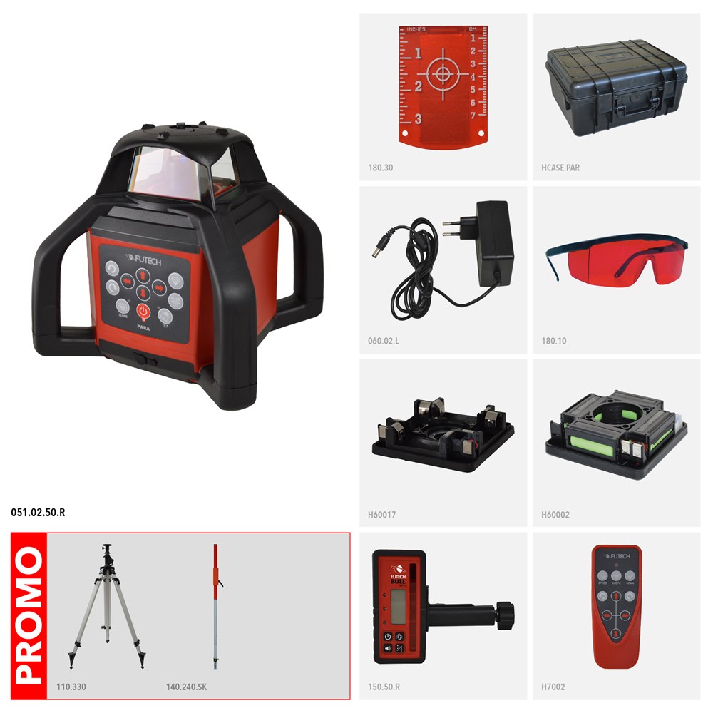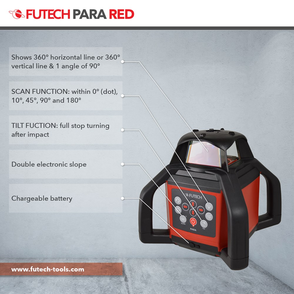 Contacteer onsMultifunctionele rode rotatielaser voor binnen- en buitengebruik (IP66) met verticale modus (Z-as) en bereik van 2x 300m met inbegrepen ontvanger (Bull Rood). Elektronische motornivellering met nauwkeurigheid van 1mm/10m en dubbele helling (X + Y-as). Beschikt over tiltfunctie, scanfunctie en netstroomadapter/lader voor onbeperkte autonomie.