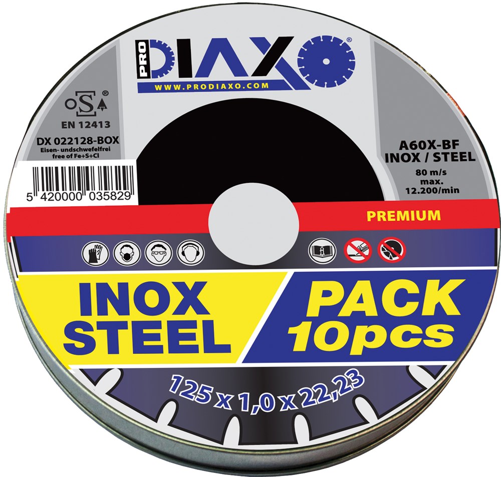 Contacteer onsPRODIAXO Artikelnummer: PPDX 022128-BOX SNIJSCHIJF INOX 125 X 1.0 MM A60X-BF / PREMIUM CONSTRUCTION - BOX 10