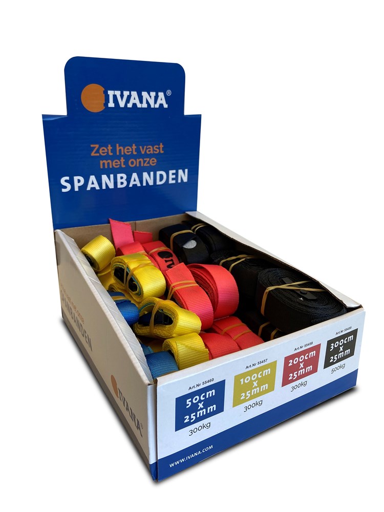 Contacteer onsZet het vast met de Ivana spanbanden. 4 verschillende maten spanbanden met gesp geleverd in display, 50cm, 100cm, 200cm en 300cm.