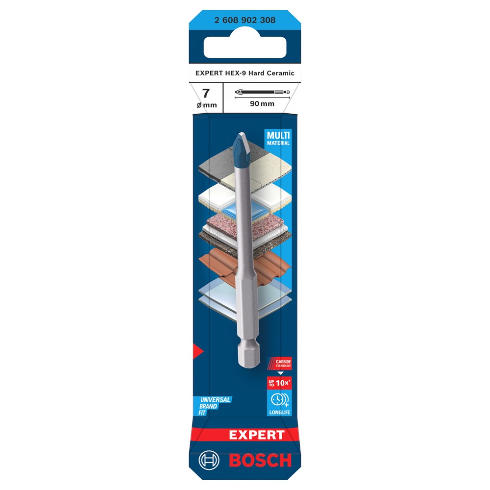 De Bosch EXPERT HEX-9 Hard Ceramic boor is ontworpen voor het boren van keramiek en kan zonder smeer- of koelmiddel gaten boren in harde tegels.