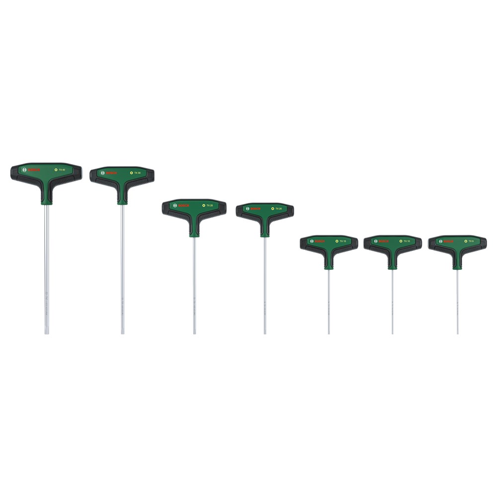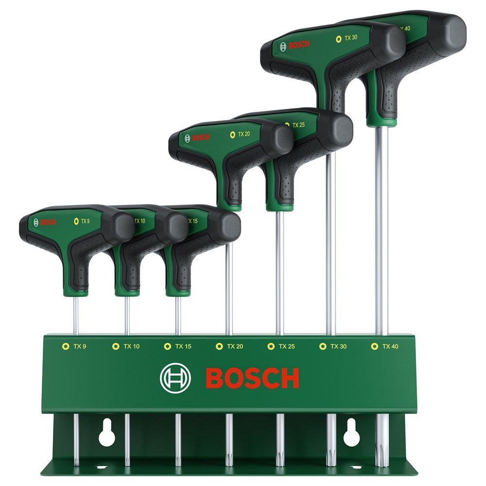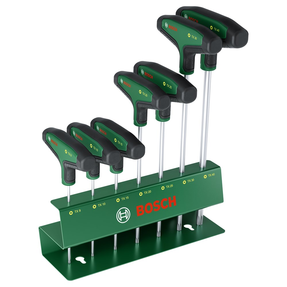 De 7-delige Torx-schroevendraaierset met T-handgreep van Bosch biedt meer gemak en flexibiliteit voor het uitvoeren van klussen in en om het huis. Alle Torx-schroevendraaiers met T-handgreep (TX9, TX10, TX15, TX20, TX25, TX30, TX40) zijn een klasse apart voor gecontroleerd en krachtig vastdraaien, zelfs op moeilijk bereikbare plaatsen, bij het monteren van meubels of het onderhoud van fietsen, motoren en auto's. De ergonomische tweecomponenten T-handgrepen met grote softgripvlakken zijn ontworpen voor comfort en efficiënte krachtoverbrenging tijdens schroefklussen, zelfs wanneer een hoog koppel is vereist. Elke T-handgreepschroevendraaier heeft een eersteklas S2-stalen schacht (56 - 60 HRC). De extra lange schachten maken het gemakkelijker om nauwkeurig te werken op smalle, moeilijk bereikbare plaatsen. Dankzij de intuïtieve maataanduidingen op de handgrepen is het gemakkelijk om voor elke klus de juiste schroevendraaier te kiezen. De T-handgreepschroevendraaiers worden overzichtelijk geleverd in een metalen rek dat kan staan of aan een muur kan worden gemonteerd.