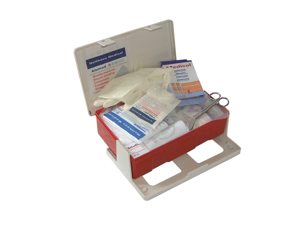 Inhoud: 2 wondsnelverband 6 x 8cm - 4 snelverband nr. 1 (klein) - 2 snelverband nr. 2 (middel) - 16 steriele gaasjes 1/16 - 10 steriele gaasjes 5x5 - 2 metalline compressen - 1 betadine/desinfectant 10 cc - 1 cambric zwachtel 4m x 6cm - 1 cambric zwachtel 4m x 8cm - 3 hydrofiel windsel 4m x 6cm - 1 doos wondpleister - 1 set wegwerphandschoenen - 2 vette of synthetische watten - 1 kleefpleister 5m x 2,5cm - 1 mondkapje voor beademing - 1 driekante doek - 2 witte watten à 10g - 4 verbandklemmetjes - 3 veiligheidsspelden - 1 splinterpincet - 1 knievormige verbandschaar (stompe punt)