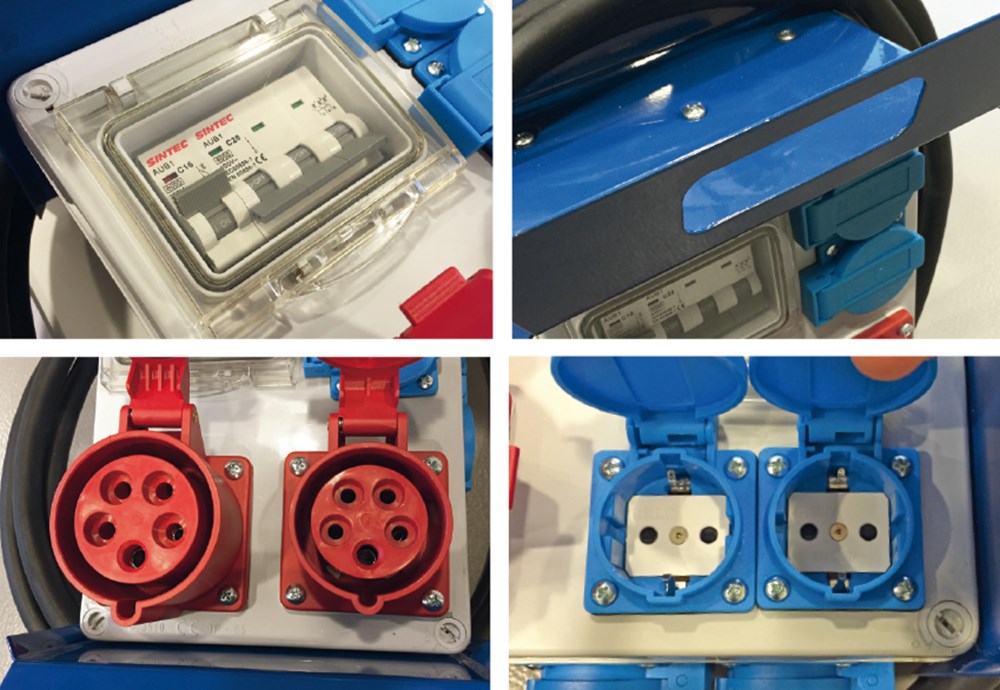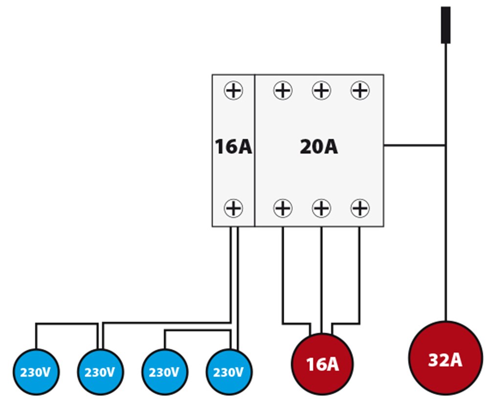 2 x 400 V (1 x 16A + 1 x 32A - driefasig) + 4 x 230 V (16A - monofase - SCHUKO)