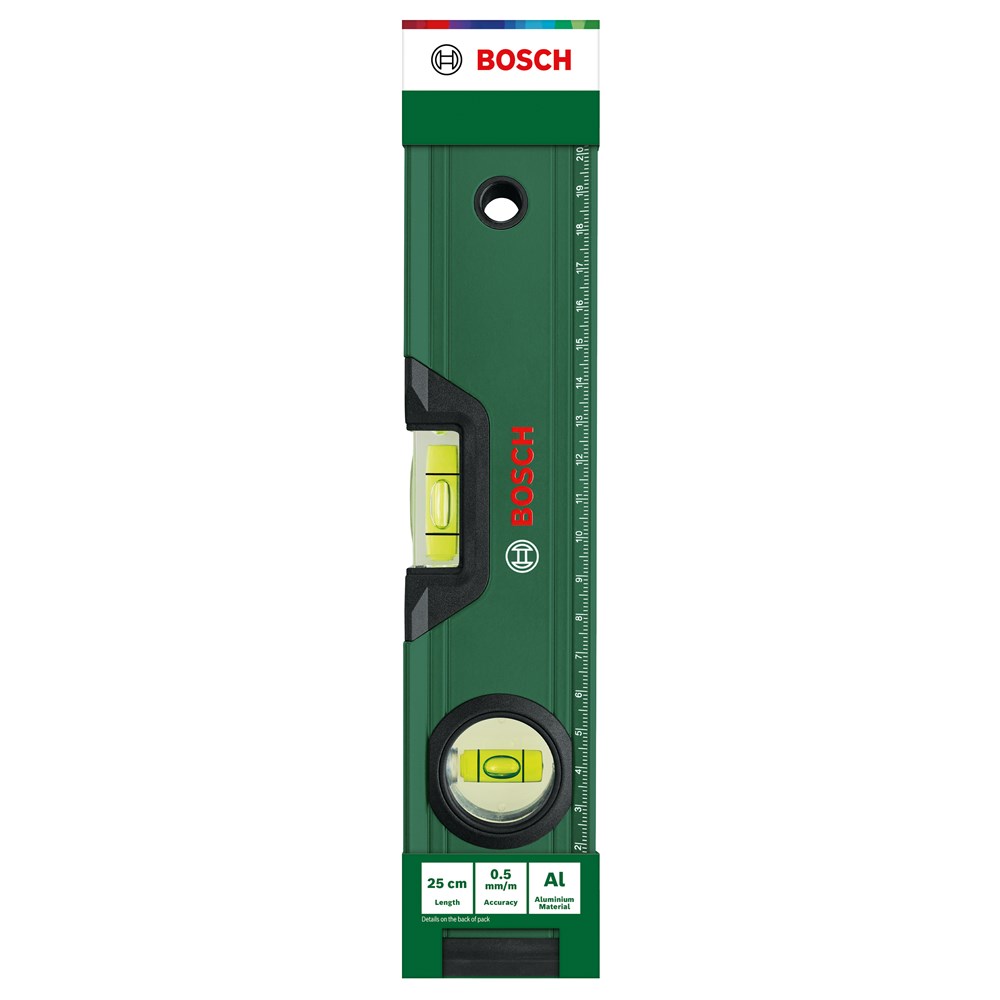 Met de Bosch waterpas 25 cm hangen schappen en schilderijen in een mum van tijd recht. Deze praktische allrounder levert zeer accurate resultaten tot 0,05 mm/m dankzij horizontale en verticale libellen. Het aflezen van de waterpas is eenvoudig door de heldere, fluorescerende vloeistof in de libellen. Deze waterpas heeft een metrische schaalverdeling van 0 tot 22 cm, dus er hoeft geen tweede gereedschap erbij te worden gehaald aangezien deze ook dienst doet als liniaal. Zowel vlakke als gebogen oppervlakken kunnen worden uitgelijnd dankzij de V-groef en vlak gefreesde onderkant van de waterpas. Dit gereedschap is robuust: doe-het-zelfliefhebbers zullen de robuuste, lichte aluminium constructie, versterkte ribben, beschermende eindkappen met anti-slipvoorzieningen met softgrip evenals het praktische markeergat weten te waarderen, dat ook kan worden gebruikt voor ophangen en opbergen wanneer de klussen zijn geklaard.