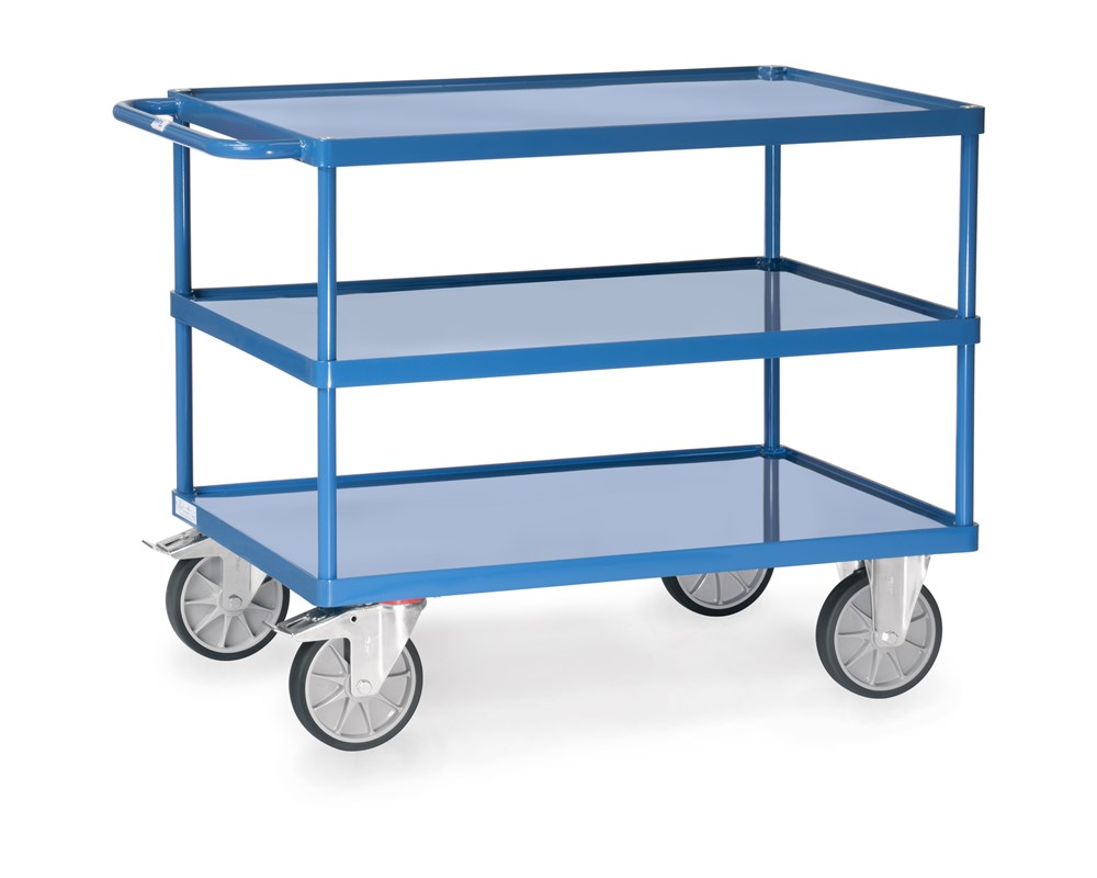 Contacteer onsStalen buis en gelast profielstaal, gepoedercoat RAL 5007. 3 Stalen etages met 10 mm hoge rand, oliedicht gelast, gepoedercoat RAL 5007. 2 Zwenk- en 2 bokwielen, TPE rubber, naaf met kogellager. Zwenkwielen met rem, conform EU-norm EN 1757-3 (veiligheidsnorm voor platformwagens). Draagvermogen bovenste en middelste laadvlak 200 kg.